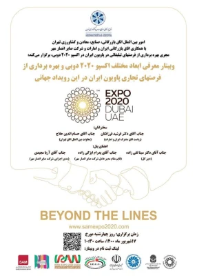 وبینار «معرفی پتانسیلهای اقتصادی اکسپو دوبی» با همکاری اتاق بازرگانی، صنایع، معادن و کشاورزی تهران و اتاق مشترک بازرگانی ایران-امارات و با هدف افزایش آگاهی فعالان اقتصادی از نحوه مشارکت و حضور در این رویداد و همچنین، اطلاعرسانی برنامه اعزام هیئتهای تجاری مصادف با نمایشگاههای تخصصی در دوبی، در ساعت ۱۰:۳۰ صبح روز چهارشنبه، مورخ ۱۷ شهریور ماه ۱۴۰۰ به صورت مجازی برگزار خواهد شد.